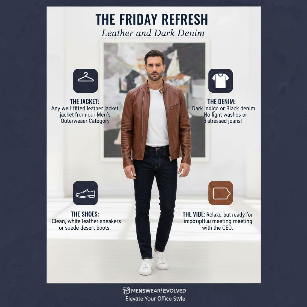 Pourquoi ça marche : Le cuir agit comme un substitut moderne au veston sport, vous donnant une énergie à la fois accessible et autoritaire.