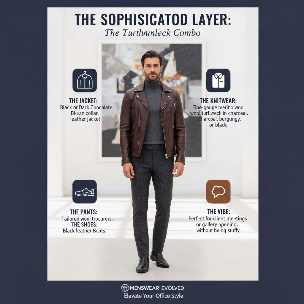 Lorsque les températures chutent, le col roulé est le meilleur ami de l'homme. Il est élégant, il élance le cou et il crie « directeur artistique ». Associer un col roulé avec du cuir crée une silhouette affûtée qui est indéniablement professionnelle.
