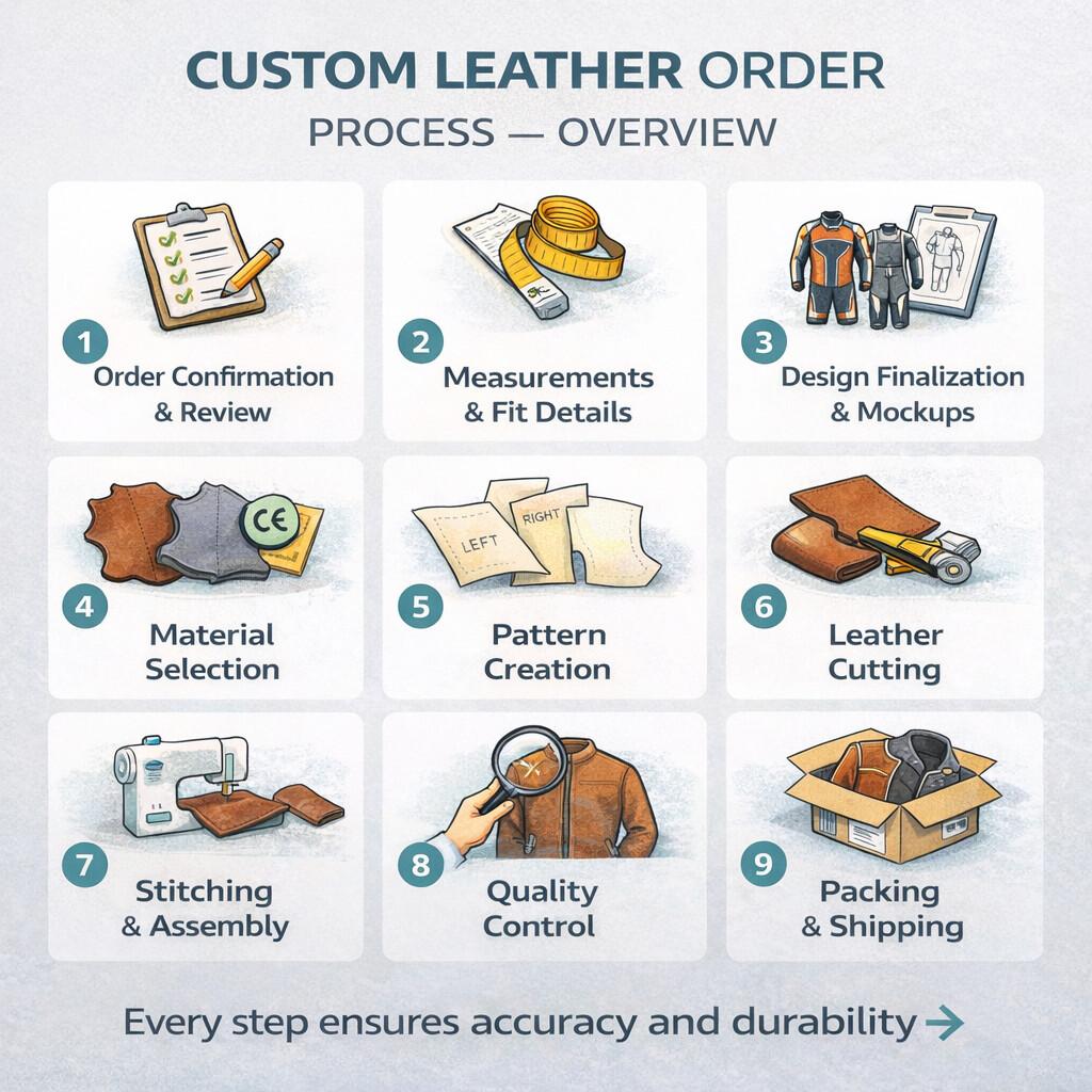 J'entends souvent la même question de la part de mes clients : « Que se passe-t-il réellement après que j'ai passé une commande de cuir personnalisée ? » C'est une question légitime. Un équipement personnalisé est quelque chose de très personnel, et vous voulez savoir exactement comment votre blouson ou votre combinaison prend vie.