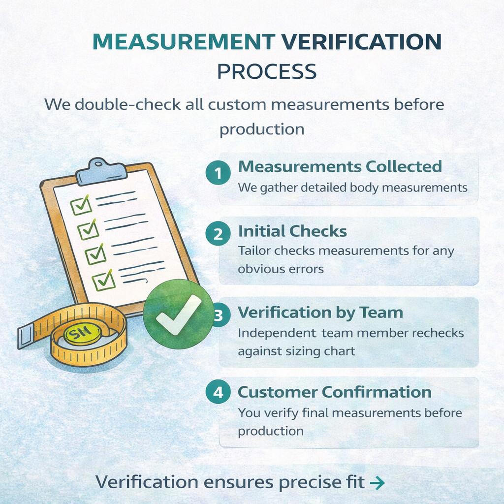 Si vous avez choisi une taille standard, nous vérifions tout de même votre taille et votre poids. Si vous avez sélectionné l'option sur mesure, nous vous demandons des mesures corporelles détaillées.