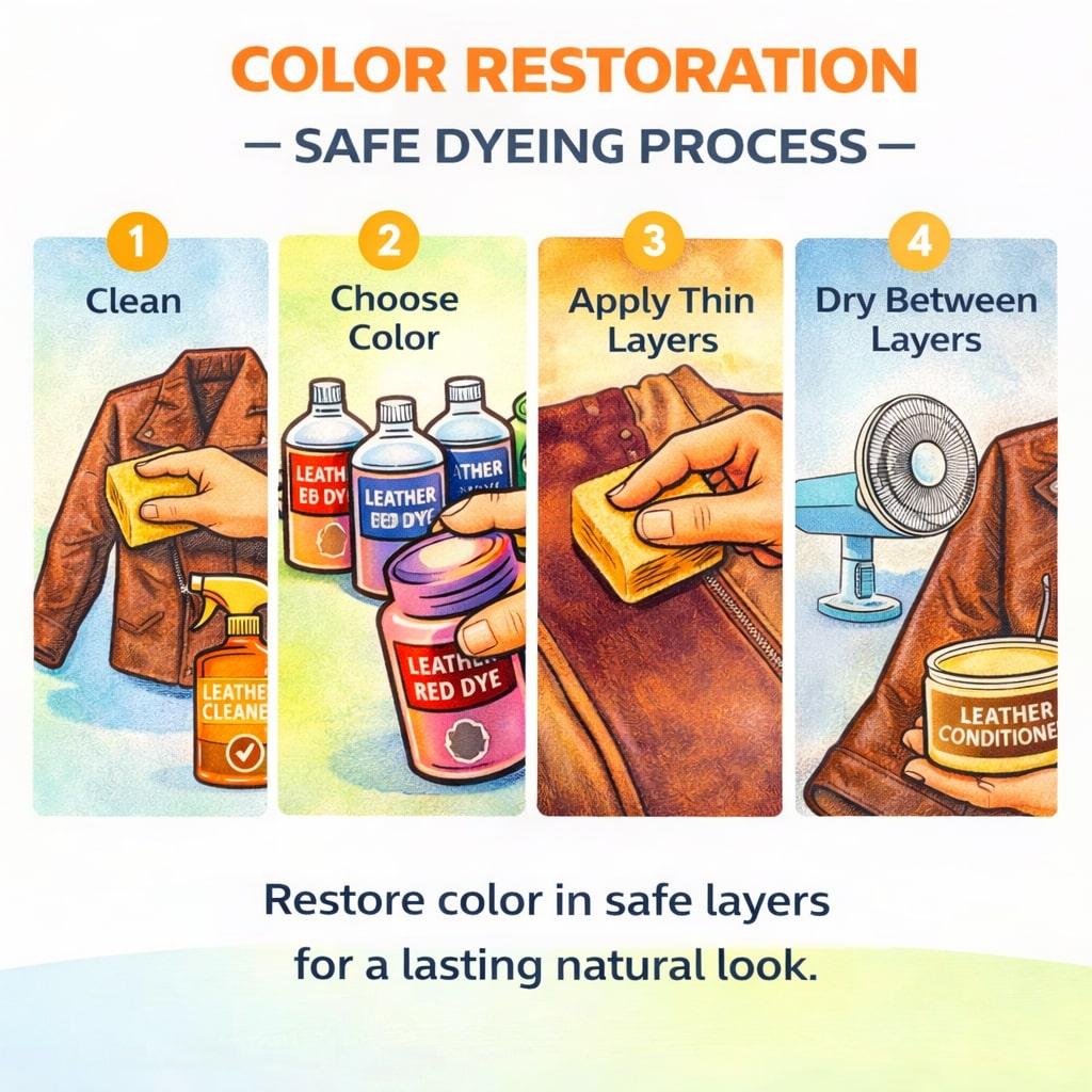 Utilisez une éponge ou un applicateur souple et appliquez la couleur en couches fines et régulières. Tamponnez délicatement plutôt que de frotter fort. Ne versez jamais la teinture directement sur le cuir, car cela peut provoquer des taches et une couverture inégale.