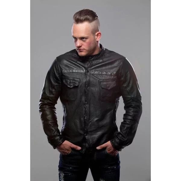 - Style / Design Features: Shirt-style black leather jacket; waxed stitching; short length; two chest pockets with studs; collar and cuffs