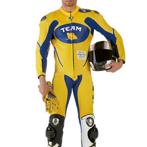 - Construction: Full-leather racing suit with reinforced seams; external CE protectors on shoulders, elbows, knees; removable dual-density armor at shoulders, elbows, knees; removable dual-density spine protector; additional leather overlays on shoulders, elbows, knees, hips; foam padding at elbows and knees; pre-curved sleeves; semi auto-lock YKK zippers at front, cuffs, calves; Velcro neck, cuffs, calves; knee sliders removable; inner polyester mesh lining; optional aerodynamic hump