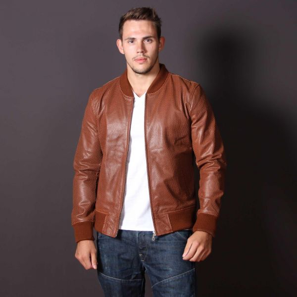 - Construction: Perforated goatskin bomber with two interior zip pockets; front zip fastening; ribbed waist and cuffs; stand-alone collar band