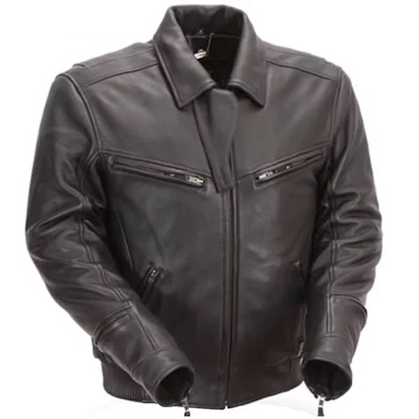 - Style / Design Features: Naked leather aesthetic with vented hybrid design; snap-down shirt collar; four outside pockets; heavy hardware
