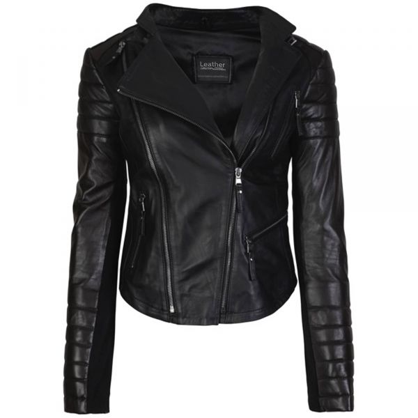 - Style / Design Features: Biker-inspired silhouette; short-length; ribbed panels on shoulders and sleeves